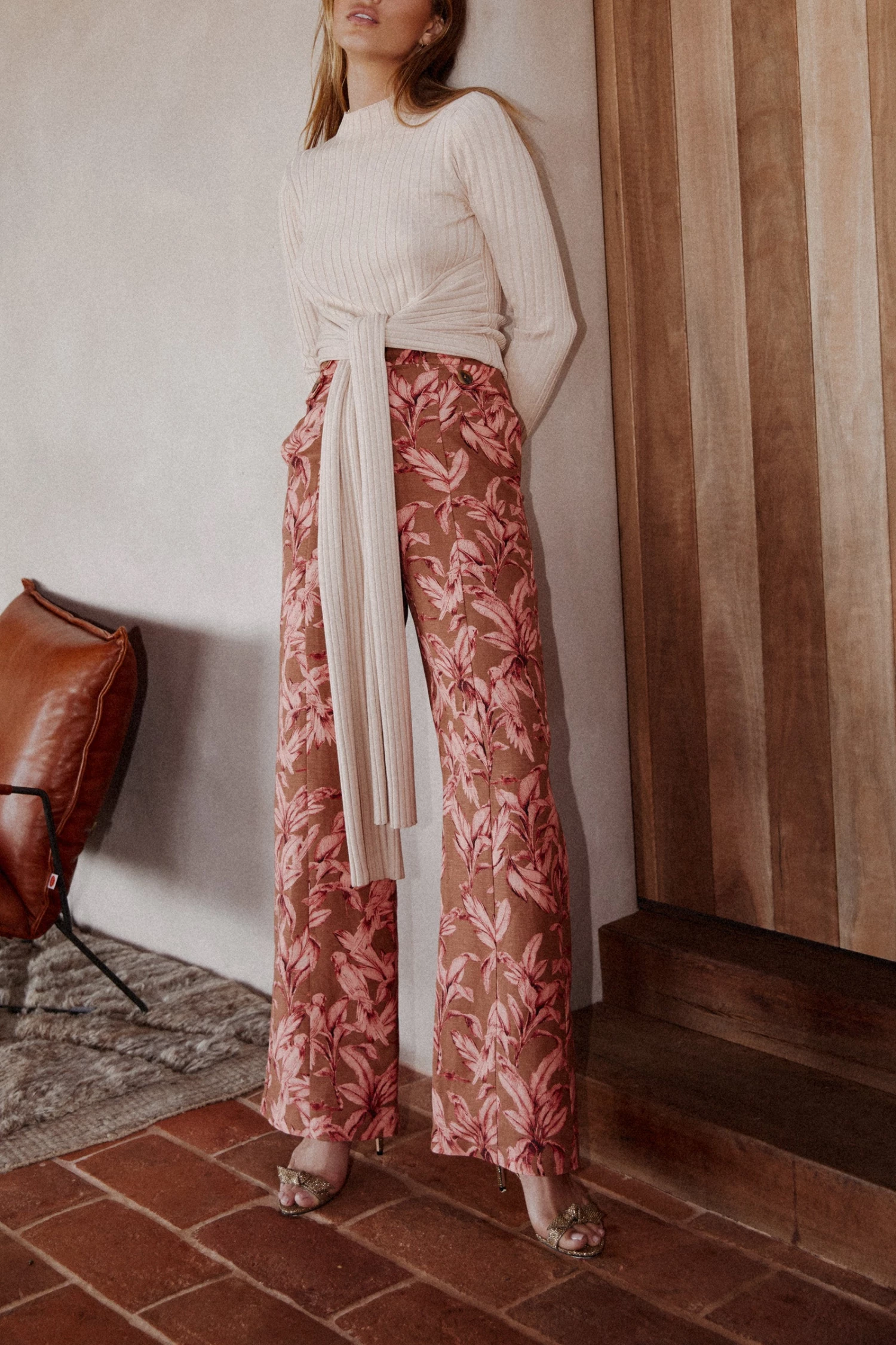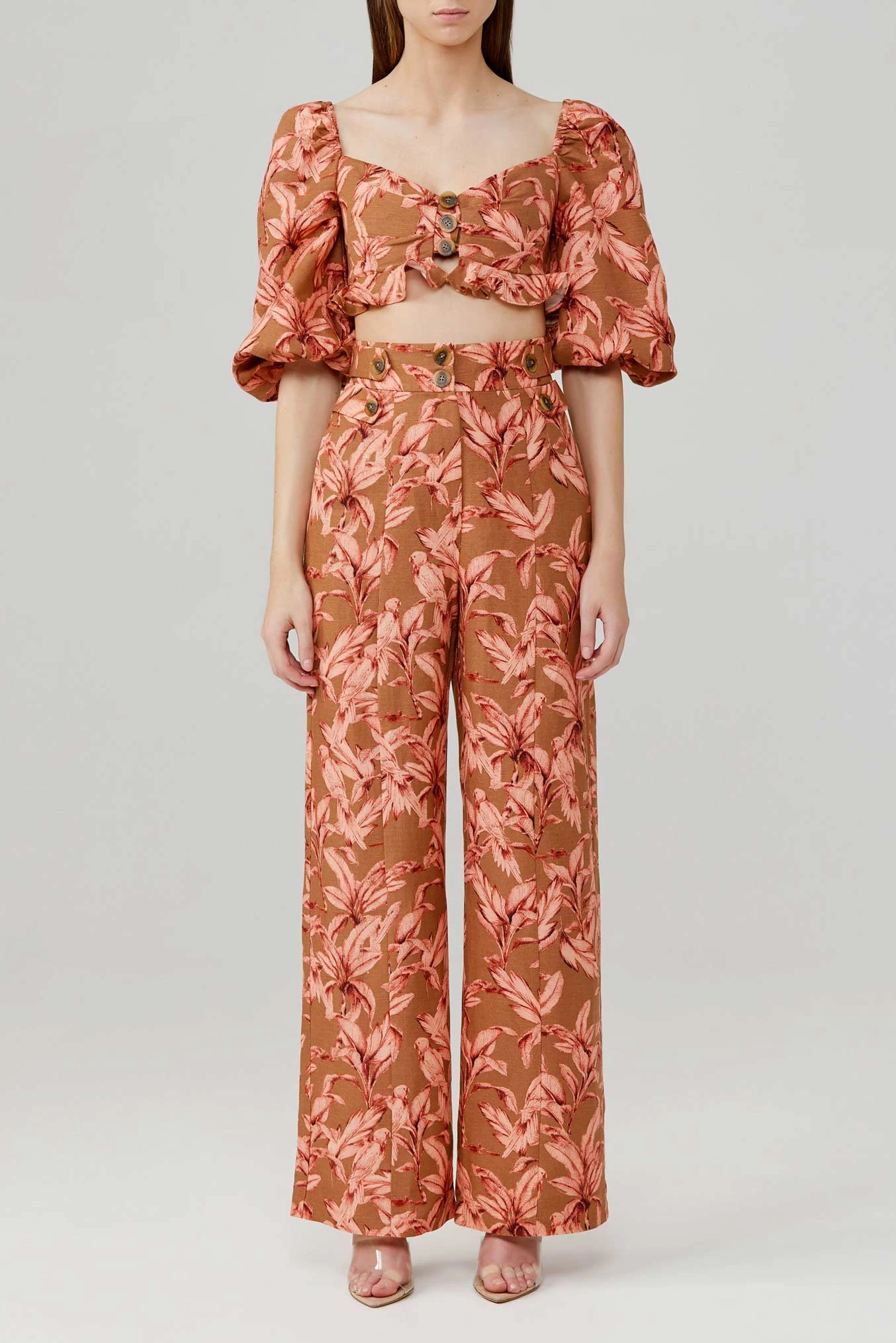 With feminine frills in beautiful linen blend fabrication, the Sienna wide leg pant is perfect to wear on a balmy evening or dressed up for a wedding or event.